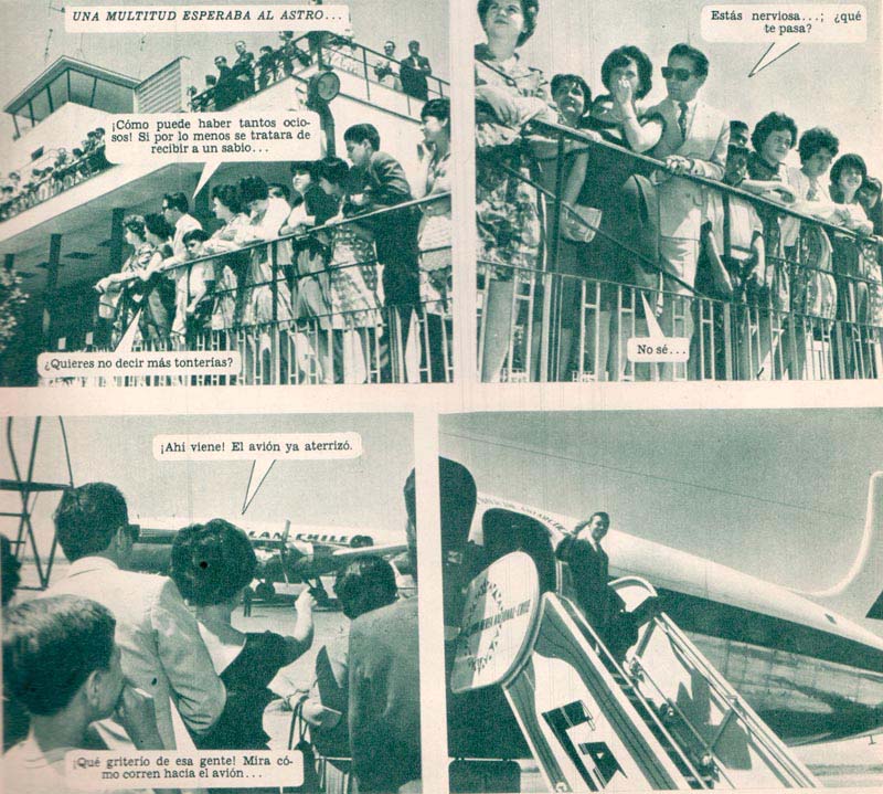 Foto Romance 94, diciembre 1966. Carlos Vittini trata de ayudar a Angelina Orlandini en el aeródromo Tobalaba. Fotos de Luis Valdés.