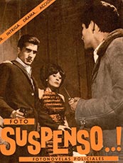 Foto Suspenso 1, febrero 1965. La primera edición de esta revista de ZigZag asienta el género policial en la oferta fotonovelesca. Jessie Carvallo, Humberto Arredondo y Francisco Morales se intimidan, registrados por David Rodríguez.