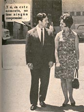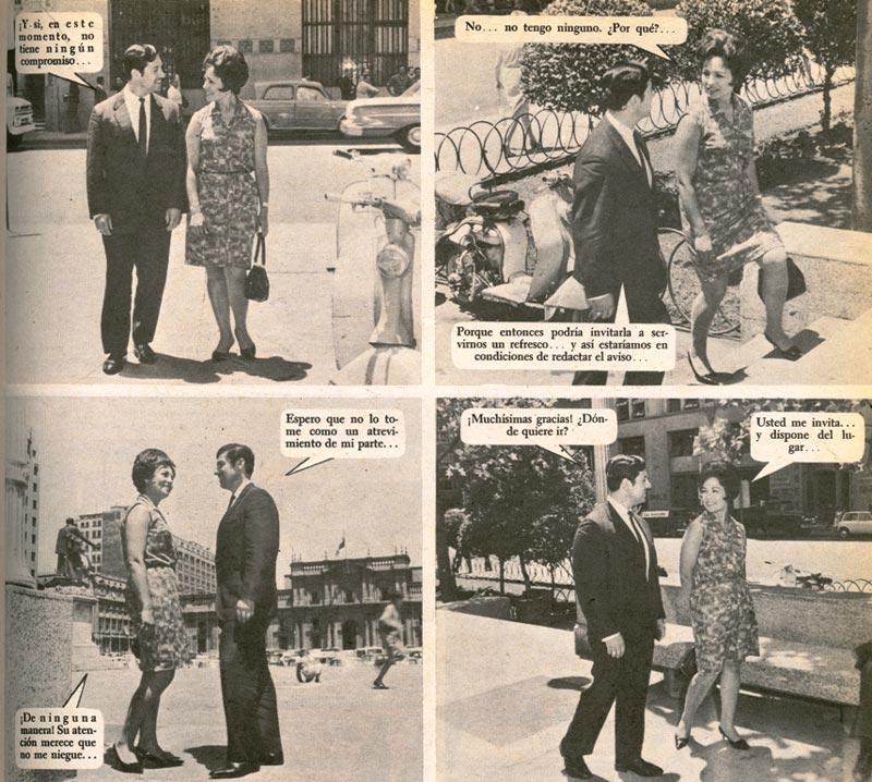 Cine Amor 294, febrero 1967. La española Teresa Oliva y el cantante mexicano Roberto Aguilar pasan frente al Palacio La Moneda, fotografiados por José Carvajal.
